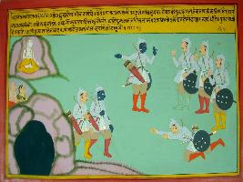 | Description / विवरण | Miniature painting based on Harivansha depicting Pradyuman with Arjun and Arjun talking to their soldiers, while in the upper right corner Shiv is sitting. |