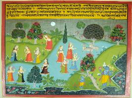 | Description / विवरण | Miniature painting based on Krishna charit depicting a scenes of Vrindavan where some gopis are waiting for Krishna, all of them are very well dressed and adorned with beautiful jewels. In the lower left side of the painting, Vishnu s Varaha incarnation is depicted holding Shankh, chakra gada and padma. |