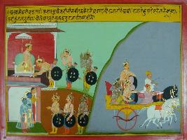 | Description / विवरण | Miniature painting based on Mahabharat - Ashwamegh parva. It depicts why Bhim killed Jarasandha and Yudhisthir performing Ashwamegh yagna. |