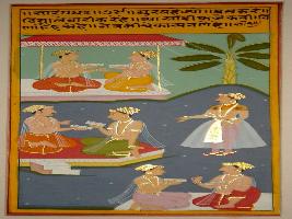 | Description / विवरण | Miniature painting based on Sarangadhar, where the poet talks about the importance of knowledge. In the painting two men are talking in the upper part. While five persons are depicted in conversation in the lower part. |