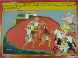 | Description / विवरण | Miniature painting based on Mahabharat - Sabha parva depicting Sahdev after defeating Sumbh defeated Mlech and kirats. After that he defeated Manikchan, chandan, Rajat, vastar, Bidrum etc. and return back to home. |