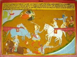 | Description / विवरण | Miniature painting based on Harivansha depicting Krishna eloping Rukmani. Krishna is shown sitting with Rukmani and shooting arrow on the army of Rukmak. Garuda is shown flying at the top right part. |