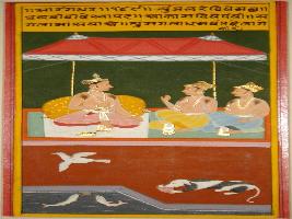 | Description / विवरण | Miniature painting based on Sarangadhar depicting sitting with nobles at upper panel, Below them, a dog is shown eating flesh. |