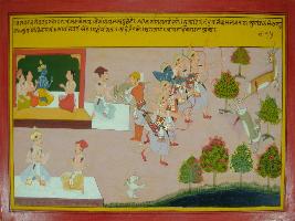 | Description / विवरण | Miniature painting based on Mahabharat - Vana parva depicting Vaishpayan is telling king Janamejeya about glory of arjun. He compared Arjun with human incarnation of Aditis son. At the left part, Pandavas are shown hunting animal. At upper right part, Arjun is shown sitting with Aditi and her sons. |