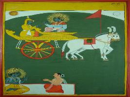 | Description / विवरण | Miniature painting based on Shri Bhagwat Gita. It depicts Krishna preaching Arjun in the lower part of the painting it depicts Krishna is sitting in front of a Brahmans and teaching him. |
