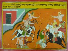 | Description / विवरण | Miniature painting based on Mahabharat - Sabha parva depicting Sahdev after defeating the king of Girivraja and Karna goes to Bangadesh and defeated Chandrasen and Samudrasen. |