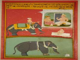 | Description / विवरण | Miniature painting based on Sarangadhar depicting an elephant rider standing outside the house of king, a man is shown sitting with a bundle of sugarcane. At the lower part, the elephant is shown tied with chains. |