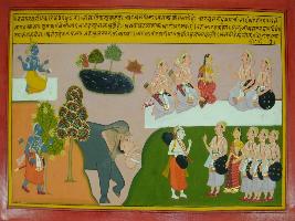 | Description / विवरण | Miniature painting based on Mahabharat - Vana parva.This painting depicted Draupadi is telling Bhim that she misses Arjun. Draupadi and Pandavas are shown sitting at upper left part. Below this, Naradis coming to meet Pandavas and is shown standing and telling a story to them. Arjunis comingt to Haridwar and mediated and met Pultasaya rishi who come to meet him. At the right part, Arjun is depicted wondering in forest, Vishnu is shown sitting. |
