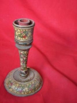 | Description / विवरण | This is a wooden candle stand. It is lacquered and painted with flowers on an ivory yellow, red, green colors and black background. |