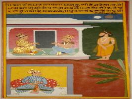 | Description / विवरण | Miniature painting based on Sarangadhar depicting two men shown sitting inside a palace with some money in between them, at the upper panel. A Brahman is shown outside the palace. At the lower panel, a man is shown sitting. |