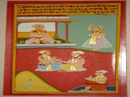 | Description / विवरण | Miniature painting based on Sarangadhar depicting two men are talking in the upper part of the painting, while three persons and a snake are seen in the lower part. The painting says that human beings have self praising attitude which is harmful. |