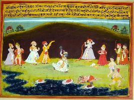 | Description / विवरण | Miniature painting based on Krishna charit depicting the scene of killing of a demon, sent by Kansa. The demon came in the form of washerman and Krishna kills him by chopping off his head with Sudarshan chakra. It is an unfinished painting. |