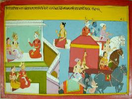 | Description / विवरण | Miniature painting based on Harivansha depicting Baldev talking with Krishna and on the left side Baldev and Krishna is going somewhere on chariot. |