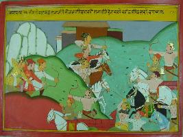 | Description / विवरण | Miniature painting based on Mahabharat - Sabha parva depicting Bhim conquered king of Kaccha, king Gopala, king Soma and Malwa king. He conquered over land Hamachal and moves forward. |