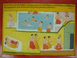 | Description / विवरण | Miniature painting based on Mahabharat - Vana parva depicting he who goes to Jambu narga will get the fruitfulness of one Ashwamegh yagna. He who goes to the ashram of Nahaluk sage will get Brahma loka and he who goes to the ashram of Agastsya sage will reach Kartikeya. |