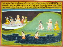 | Description / विवरण | Miniature painting based on Krishna charit. On top right part of the painting, Akrura is depicted sitting with Krishna Balram. In left part, Nanda is depicted coming with Krishna and Balram to Akrura s palace. In lower part, Akrura is depicted taking bath in river. |