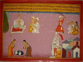 | Description / विवरण | Miniature painting based on Mahabharat - Ashwamegh parva depicting Bhim telling Yudhisthir that when he was coming with black horse through a village, he saw a chandalini and Brahmani taking water from same well and a person beating his parents. |
