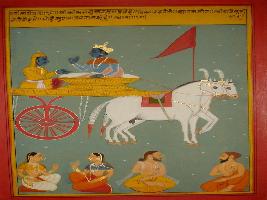 | Description / विवरण | Miniature painting based on Shri Bhagwat Gita. Krishna and Arjun where Arjun asking Krishna about soul, glory and the physical desire of man. |