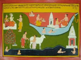 | Description / विवरण | Miniature painting based on Mahabharat - Vana parva depicting he who goes to Mahaka will get the fruitfulness of Kout pilgrimage after that who goes to Thanu tirth will get the fruitfulness of 100 go-dana. He who worshipped the Devtas near the bank of Narmada will get the fruitfulness of Agni worship. At the upper right Mahadev is seen with his gana. |