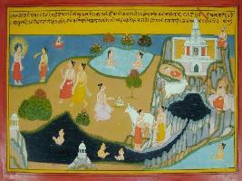 | Description / विवरण | Miniature painting based on Mahabharat - Vana parva depicting that two men going to the sea and get the fruitfulness of Agni worship, after that theyare going to Charmvati river and worshipped gods. After that theyare goingto the ashram of Vaistha and get the fruitfulness of 100 go-dana. After that they visit Pinga and Pravash tirth. |