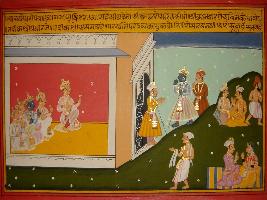 | Description / विवरण | Miniature painting based on Mahabharat - Ashwamegh parva depicting Vyas preaching Yudhisthir and thinking of Krishna. At that time Krishna arrives there. |