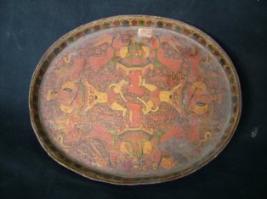 | Description / विवरण | This is an oval tray. It is lacquered and painted. Its central part has demons and princes. Its back side is black painted. |