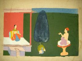 | Description / विवरण | Miniature painting depicting Nayak and Nayika. Nayika is sitting on couch on palatial terrace and Nayak on Asana outside the palace. It is an incomplete painting. |