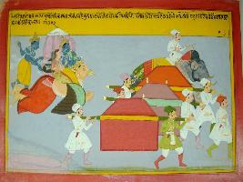| Description / विवरण | Miniature painting based on Harivansha depicting lord Vishnu with his wife seated on Garuda, which is flying in the sky. In the other part, some men are carrying Palanquins. |