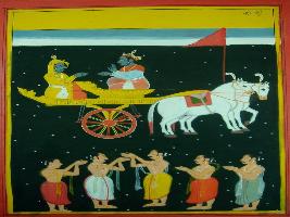| Description / विवरण | Miniature painting based on Shri Bhagwat Gita. It depicts Krishna preaching Arjun the lower part of the painting depicts Brahmans are performing puja. |
