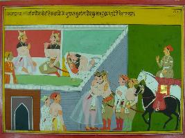 | Description / विवरण | Miniature painting based on Mahabharat - Sabha parva depicting Bhishma is going to Chedi kingdom, meet king Shisupal, hugged each other and asked about the well being of Pandavas. Bhishma is spending the night there. |