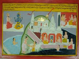 | Description / विवरण | Miniature painting based on Mahabharat - Vana parva depicting on the upper right sage Durbasa is giving boon to Vishnu. At the centre painting depict the Dwarika city where Vishnu is worshipped. The painting also depict the confluance of Sindu river and the sea. |