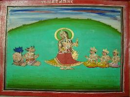 | Description / विवरण | Miniature painting depicting Mohini Avatar Vishnu as Mohini depicted dividing Amrit that come out of Samudra manthan among Devtas and Aasurs. |