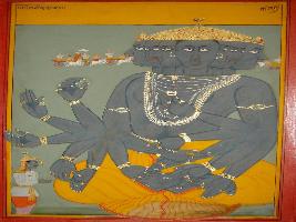 | Description / विवरण | Miniature painting based on Shri Bhagwat Gita. Vishwaroop of Krishna and Arjun is seen by folded his hands. |