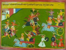 | Description / विवरण | Miniature painting based on Mahabharat - Sabha parva depicting Bhim is conquering the countries of eastern direction. Then he reached Punnad nagar and conquer it too. |