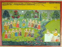 | Description / विवरण | Miniature painting based on Krishna Lila depicting Krishna with halo behind and Gopis are in row in the garden. In the left side a noble male is being instructed by 3 yogis saint . |