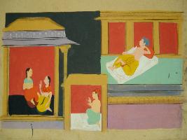 | Description / विवरण | Miniature painting depicting Nayak and Nayika. Nayak is depicted sleeping on one corner, Nayika is depicted talking with her friend on one corner, a man also is depicted sitting in centre. It is an incomplete painting. |