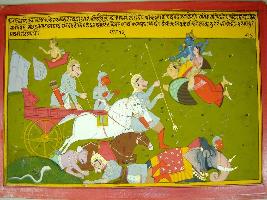 | Description / विवरण | Miniature painting based on Harivansha depicting a scene of battle field in which Narkasur is being killed by Krishna, who is attacking with bow and arrows. The battle is compared to Indra breaking a mountain. |