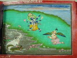 | Description / विवरण | Miniature painting depicting Shri Hari Avatar, Gajendramoksha is depicted caught by crocodile in water and Vishnu and Garuda depicted coming for his help. |