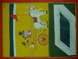 | Description / विवरण | Miniature painting based on Shri Bhagwat Gita. It depicts Krishna preaching Arjun in the lower part of the painting there is a water tank. |