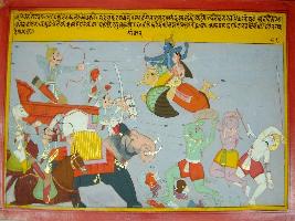 | Description / विवरण | Miniature painting based on Harivansha depicting a scene of battle field in which Narkasur, with his army, is fighting against Krishna sitting with Satyabhama on Garuda. |