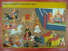 | Description / विवरण | Miniature painting based on Mahabharat - Sabha parva depicting Arjun coming back to Indraprastha with lots of wealth and meet king Yudhisthir. |