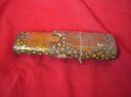 | Description / विवरण | This is cheroot case of paper mache. It is painted and lacquered. Its middle part is circular in shape painted with floral pattern. Other part has been painted. |