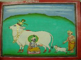 | Description / विवरण | Miniature painting depicting Pradyu avatar Vishnu is depicted taking out milk from a cow. |