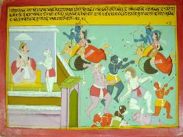 | Description / विवरण | Miniature painting based on Harivansha depicting a common Aasur present at the court of Aasurs king. In another half portion of the painting fighting still continue between Krishna and Aasurs. Krishna is shown proclaiming victory by playing conch. |