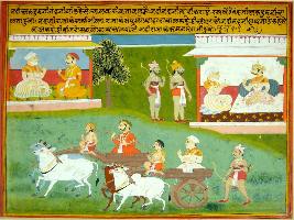 | Description / विवरण | Miniature painting based on Krishna charit depicting on the upper right corner Akrura and Nanda are in conversation. At the lower part Akrura and Nanda leaving for Mathura in two separate bullock carts. An attendant is seen behind them. The upper left corner depicted the conversation between Nanda and Kansa who is sitting on a couch. Two male attendants are seen holding bow and arrow at their right side. |