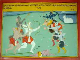 | Description / विवरण | Miniature painting based on Harivansha depicting the fighting scene of Krishna against Nikumbha and other demons. Krishna is seen on Garuda and shooting arrows. |