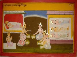 | Description / विवरण | Miniature painting based on Mahabharat - Ashwamegh parva depicting is sleeping after eating meal. |