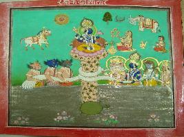 | Description / विवरण | Miniature painting depicting Kashayap the second incarnation of Vishnu during the time of Samudra Manthan. Kashayap is depicted in the sea and the Mandranchal is used as churning stick to churn the sea, Vishnu is depicted sitting on Mandranchal to balance. Sheshnaag is used as churning rope and Aasur and Devtas are depicted pulling from different side. |