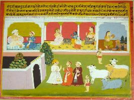 | Description / विवरण | Miniature painting based on Krishna charit depicting at the upper right corner Krishna talking to Akrura. The next part depicting conversation between Nanda and Yashoda. Rest part of the painting depicts Krishna visited each house in Braj Bhumi and says them that he is leaving for Mathura to see the festival. |