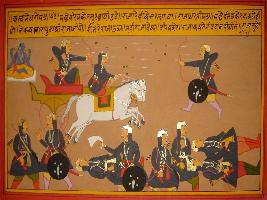 | Description / विवरण | Miniature painting based on Mahabharat - Ashwamegh parva. It depicts, fight between Brishketu and a king and the king fall down from the chariot but Brishketu let him alive. |